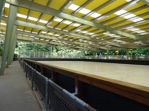 Die Rollsportanlage ist überdacht und beleuchtet, außerdem ist eine kleine Tribüne angegliedert.