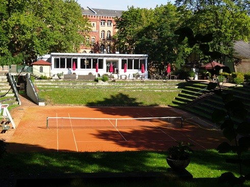 Mehrere Tennis-Trainingsplätze, einer davon mit Atrium aus Sitzbänken. Die Anlage wird vom Tennis-Club Tiergarten verwaltet.