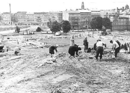 Wo heute der Fritz-Schloß-Park wächst, ist nach dem Zweiten Weltkrieg zunächst eine Trümmerhalde. Ab 1955 wird er zur Grünanlage umgestaltet.